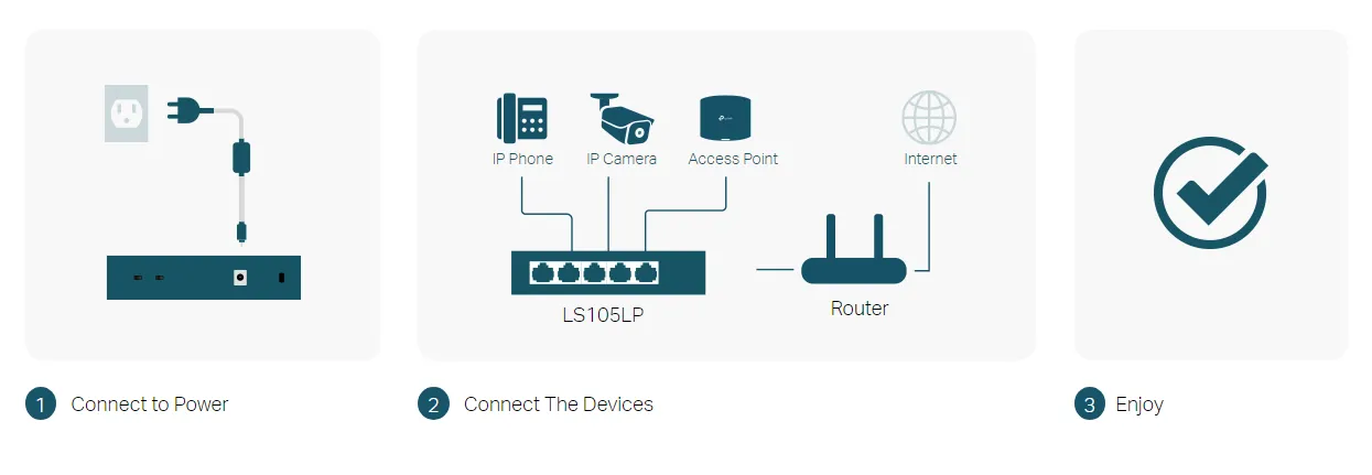 - 41 W PoE бюджет: Четири 10/100 Mbps 802.3af-съвместими PoE портове лесно свързват и захранват фиксирани устройства като IP камери, точки за достъп и IP телефони чрез един кабел. До 15,4 W PoE изход се поддържа от всеки PoE порт.