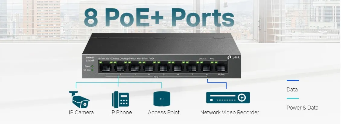 Комутатор TP-Link LS109P 9-портов 10/100Mbps с 8-портов PoE+