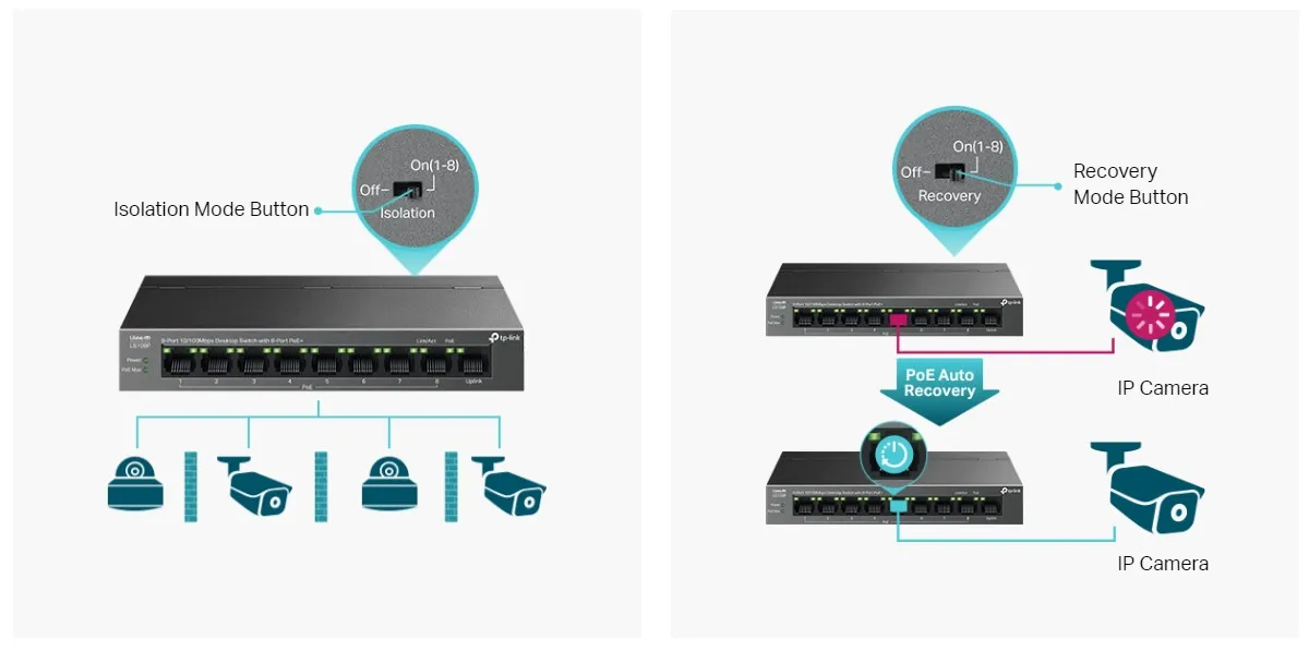 - 63 W PoE бюджет: Осем 10/100 Mbps 802.3af/at-съвместими PoE порта лесно свързват и захранват фиксирани устройства като IP камери, точки за достъп и IP телефони чрез един кабел. Всеки PoE порт поддържа до 30 W PoE изход.