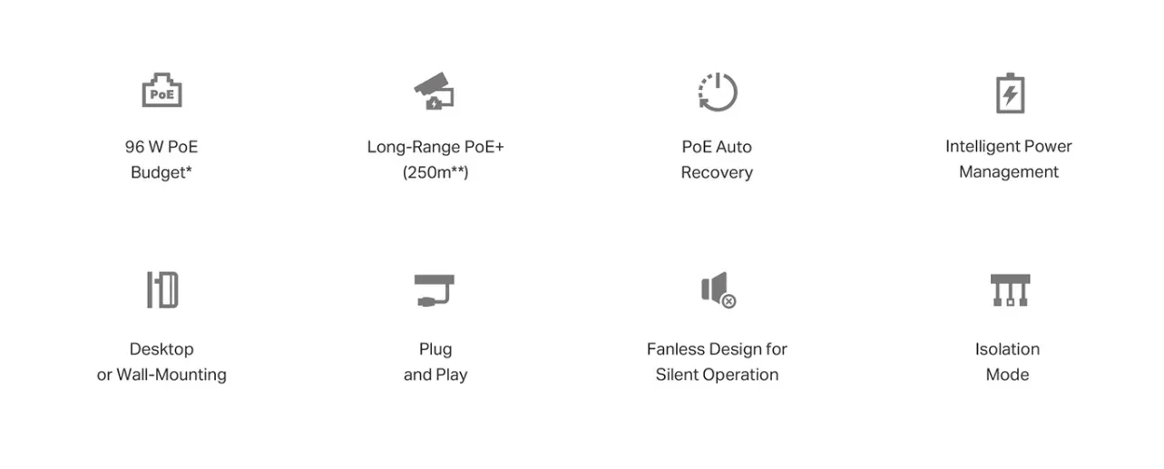 Съвместим със стандарта 802.3af/at PoE+, LS110P поддържа до 30 W на всеки PoE порт. Общият PoE бюджет от 96 W за 8-те PoE+ порта отваря широк спектър от приложения – офиси, видеонаблюдение, общежития и малки бизнеси.