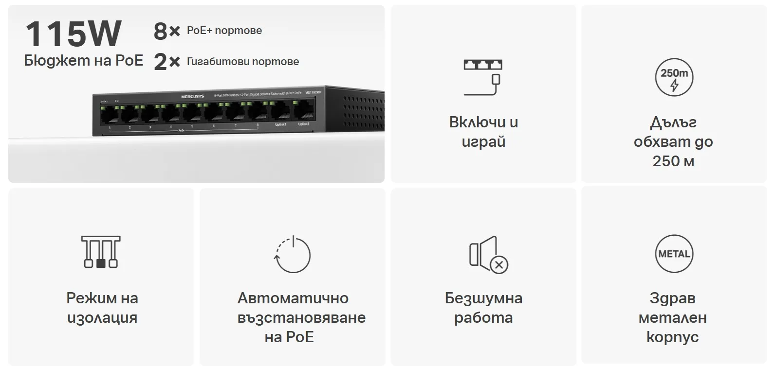 - 10 порта: 8× 10/100 Mbps PoE+ портове + 2× Gigabit non-PoE портове