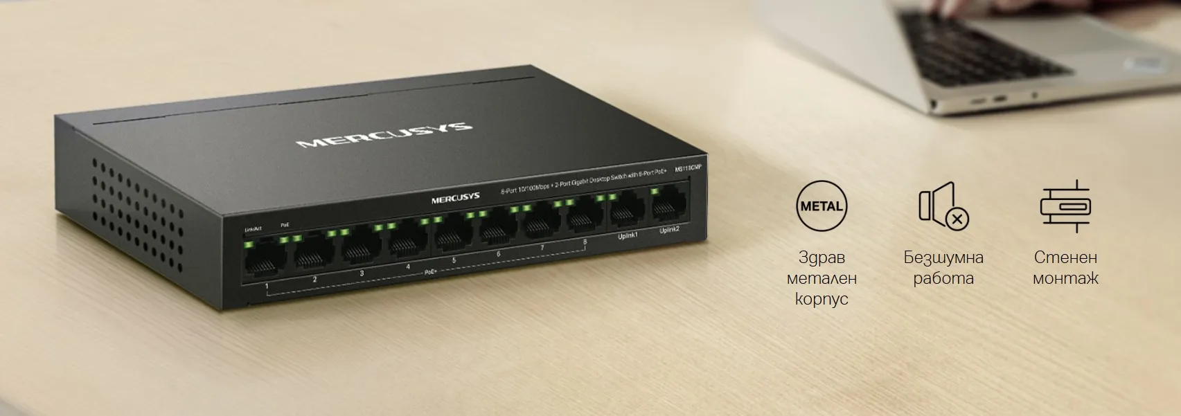 10-портов Gigabit Desktop комутатор с 8-Port PoE+ Mercusys MS110CMP