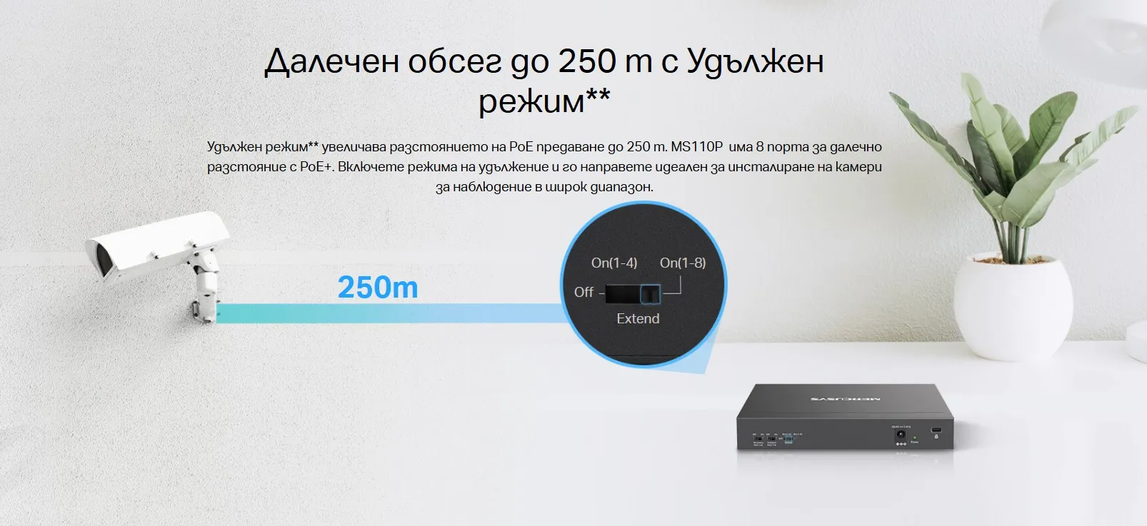 - Далечен обсег до 250 m: Увеличава PoE разстоянието на предаване до 250 m чрез Удължен режим (Extend Mode)