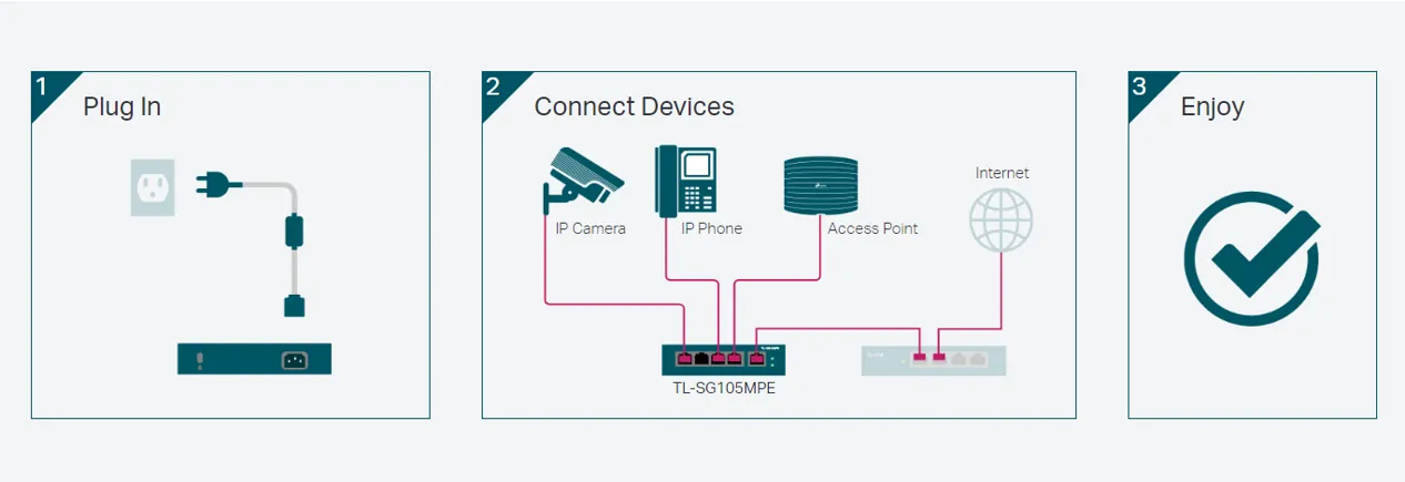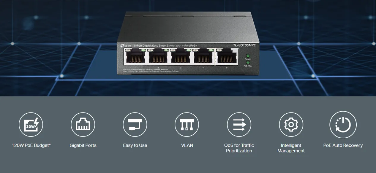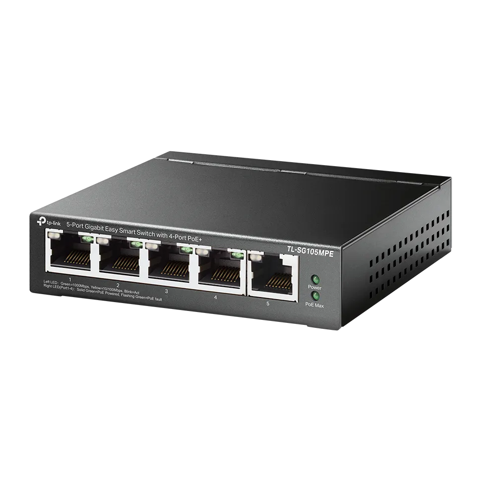 TL-SG105MPE е напълно съвместим с PoE устройства, като IP камери, точки за достъп и IP телефони. Също така работи
