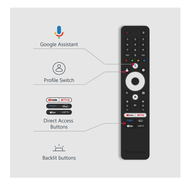 Thomson Smart UHD TV 43"; Google TV; 3840 x 2160 (4K UHD), 4000:1, DLED, 60 Hz, DVB-T/T2/C/S/S2, HDR10, Wi-Fi, Bluetooth, LAN, HDMI 2 (2.0) + 2 (2.1), USB 2 (2.0) + 1 (3.0),Central Swivel Stand, Black - 43UG5C14
