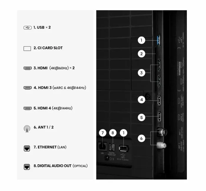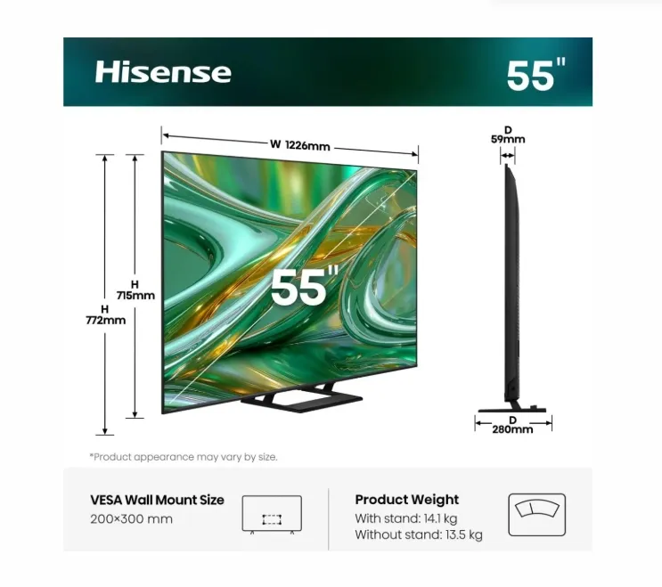 Hisense 55" E8S, 4K Ultra HD 3840x2160, ULED, Quantum Dot,144 Hz,HDR 10+, HLG, Dolby Vision, DTS Virtual X, Smart TV, WiFi, Light Sensor, BT, Anyview Cast, 4xHDMI, 2xUSB, LAN, CI+, DVB-T2/C/S2, Singale Stand, Black - 55E8S