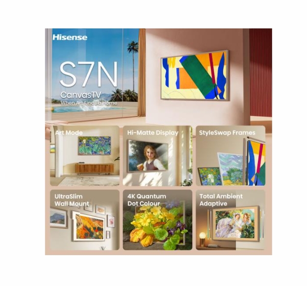 Hisense CanvasTV, 55",QLED 4K Ultra HD 3840x2160, 144hz, 4000:1, 400 nits, 16:9,VIDAA Smart OS,DTS Virtual X,HDR,HDR 10+,Dolby vision IQ, 4 xHDMI,DVB-T2/T/C/S2/S, Black - 55S7NQ