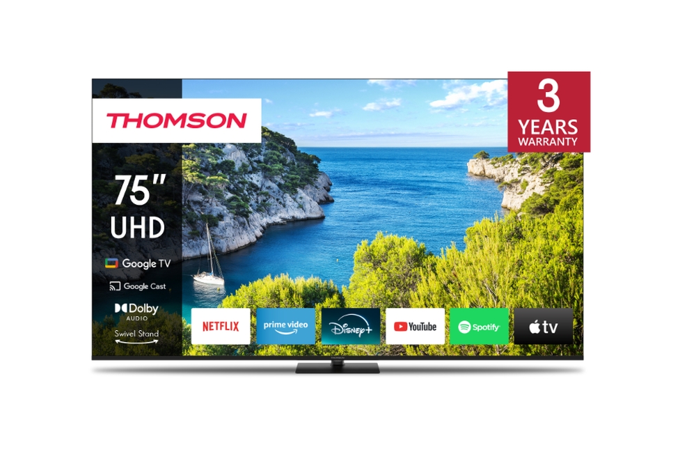Thomson Smart UHD TV 75"; Google TV; 3840 x 2160 (4K UHD), 4000:1, DLED, 60 Hz, DVB-T/T2/C/S/S2, HDR10, Wi-Fi, Bluetooth, LAN, HDMI 2 (2.0) + 2 (2.1), USB 2 (2.0) + 1 (3.0),Central Swivel Stand, Black - 75UG5C14