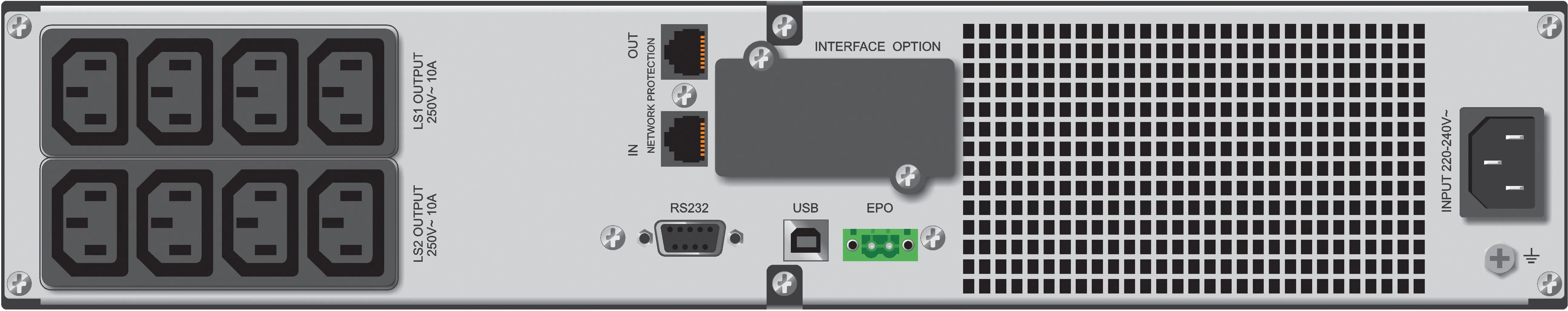 | Други : | Входни конектори: C14 Контролен панел: LCD Форма на изходното напрежение: Чиста синусоида Време за зареждане: 4ч до 90% Шум: < 45dB Време на поддръжка на товара: Пълно натоварване - 3 min;50% натоварване - 7 min Изходна честота: ±1Hz (режим батерии) Размери: 438 x 436 x 86,5 мм |