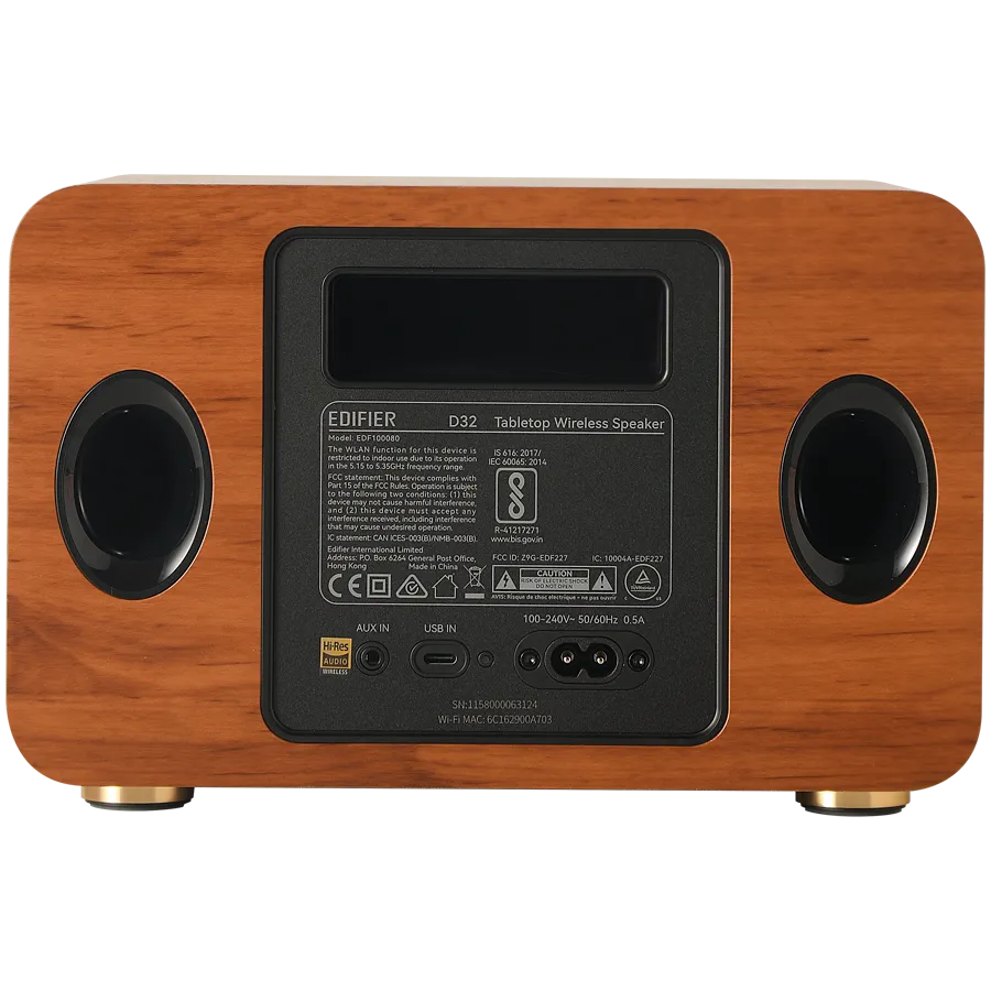 Edifier D32 2.1 Speaker, BT V5.3, Wi-Fi, AUX, USB-C, 1x 4-inch Midrange Driver, 2x 1-inch Tweeters, 60W (RMS), Brown - D32-BR