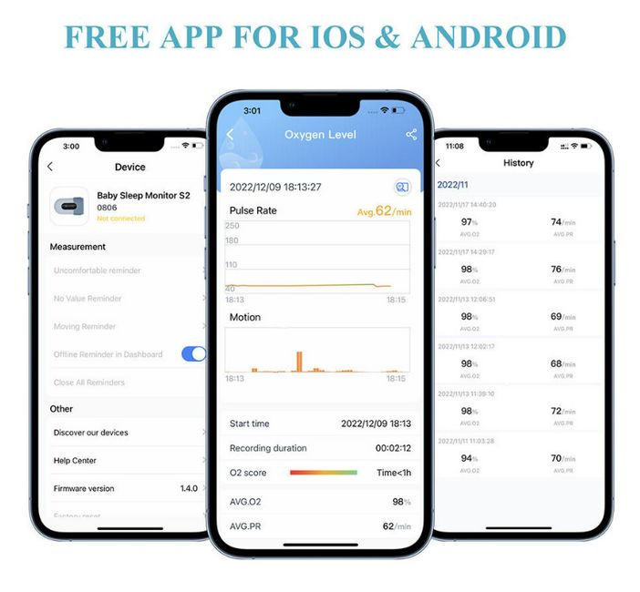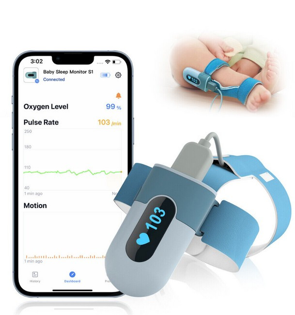 | Бебешки кислороден монитор: | Проследявайте непрекъснато сърдечната честота на бебето, средното ниво на кислород и движението на тялото всяка секунда. |