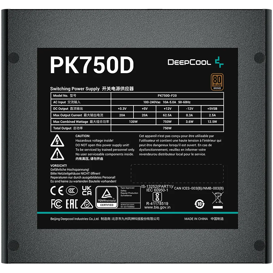 DeepCool PK750D, 750W, 80 Plus BRONZE, Taiwanese Capacitors, Flat Black Cables, 120mm Fan, SCP/OPP/OTP/OVP/OCP/UVP, 5Y, R-PK750D-FA0B-EU