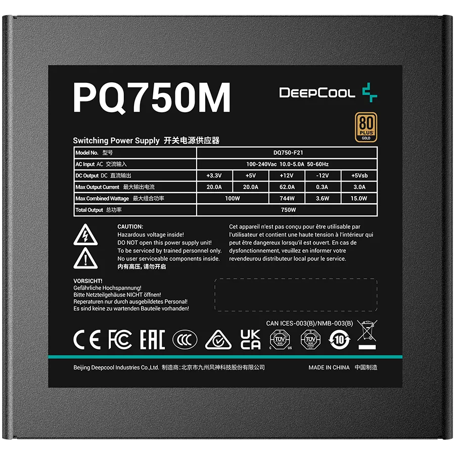 DeepCool PQ750M, 750W, 80 Plus GOLD, Full Japan Electrolytic Capacitors, Fully Modular, Flat Black Cables, 120mm FDB Fan, Fanless Mode, SCP/OPP/OTP/OVP/OCP/UVP, 10Y, R-PQ750M-FA0B-EU