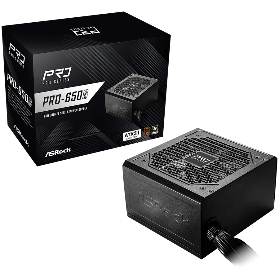 Asrock PRO-650B, 650W, 80 Plus BRONZE, Non Modular PSU, 1x EPS 12V CPU(4+4pin), 2x PCIe (6+2pin), 2x 4-pin connectors, 4x SATA, OCP, SCP, OVP, UVP, OTP, OPP protections, 120 mm Fan, ATX 3.1, 3Y warranty