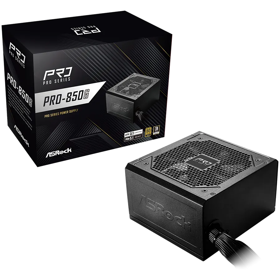 Asrock PRO-850G, 850W, 80 Plus GOLD, Non Modular PSU, 1x EPS 12V CPU(4+4pin), 2x PCIe (6+2pin), 2x 4-pin connectors, 4x SATA, OCP, SCP, OVP, UVP, OTP, OPP protections, 120 mm Fan, ATX 3.1, 3Y warranty