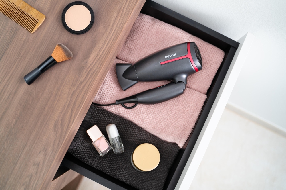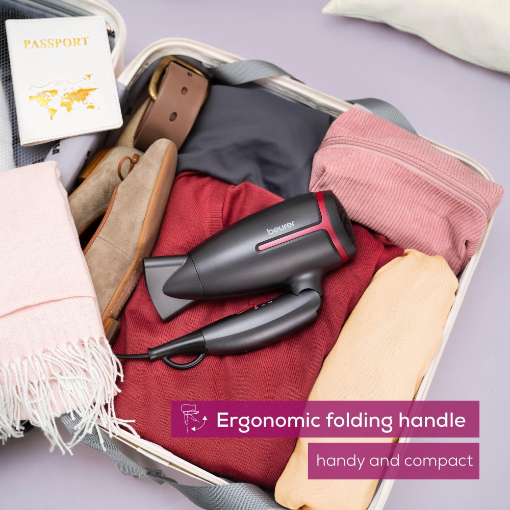Сешоарът е идеален спътник при пътуване– може да се пригоди към две различни мрежови напрежения (100–120 V и 220–240 V) и разполага със сгъваема дръжка за по-удобно съхранение.
