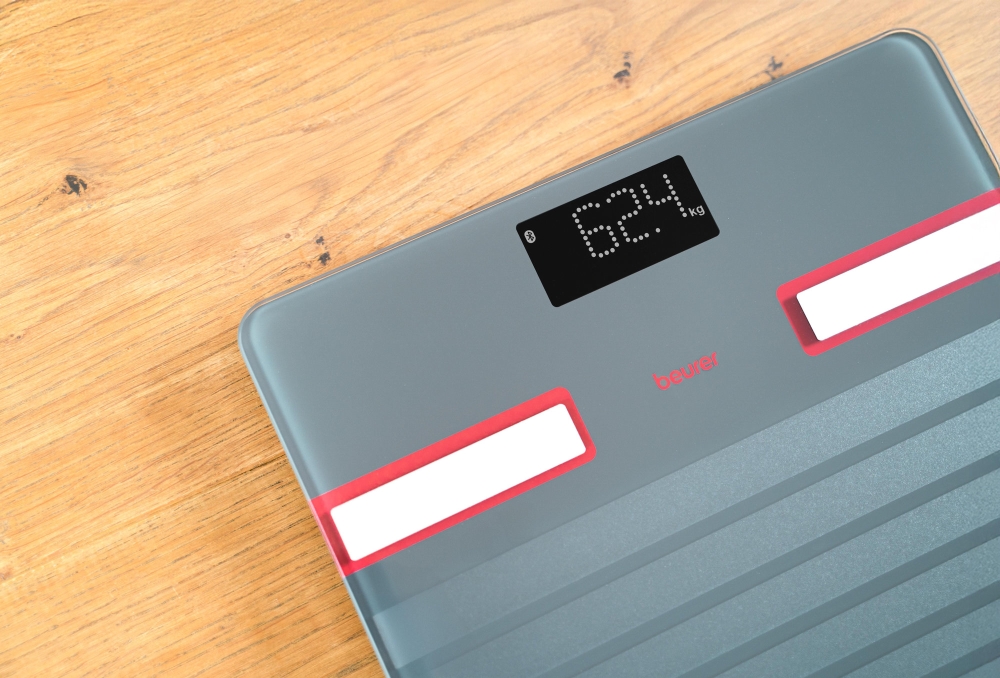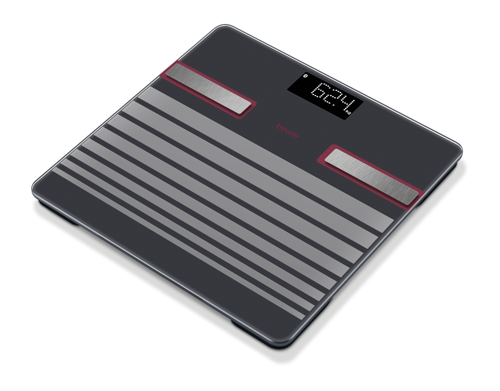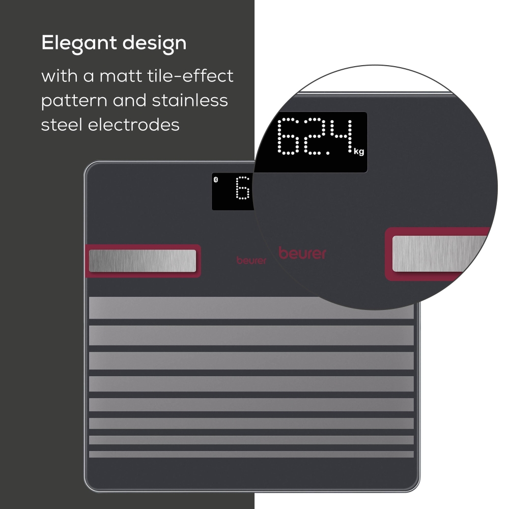Благодарение на матовата повърхност с релефни линии и електроди от полирана неръждаема стомана, кантарът измерва и показва директно върху дисплея важни здравни показатели като тегло, ИТМ, телесни мазнини, съдържание на вода и мускулна маса, като общо 17 стойности са винаги на разположение.
